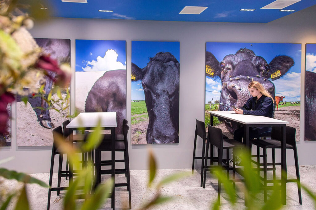 De volgende uitdaging was de vloer. Deze moest in de stijl van een boerenstal uitgewerkt worden. Met het juiste beeldmateriaal van Martina zijn we verder gegaan en hebben we een vloer geprint op vloerzeil en deze geplaatst in de ijswinkel. Dit paste precies en nu loop je als het ware ‘door’ de boerenstal.