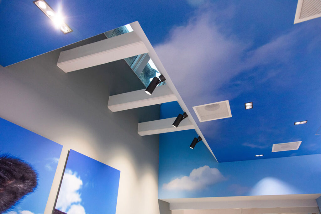 Het pand is vanaf voor- tot aan de achterzijde volledig in full color geprint behang gezet. Zelfs het plafond moesten we hierin meenemen zodat er een mooie open ruimte met blauwe luchten is ontstaan. Het beeldmateriaal met de prachtige uitzichten zijn gemaakt door fotografe Martina Ketelaar.