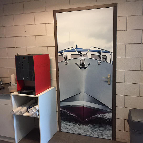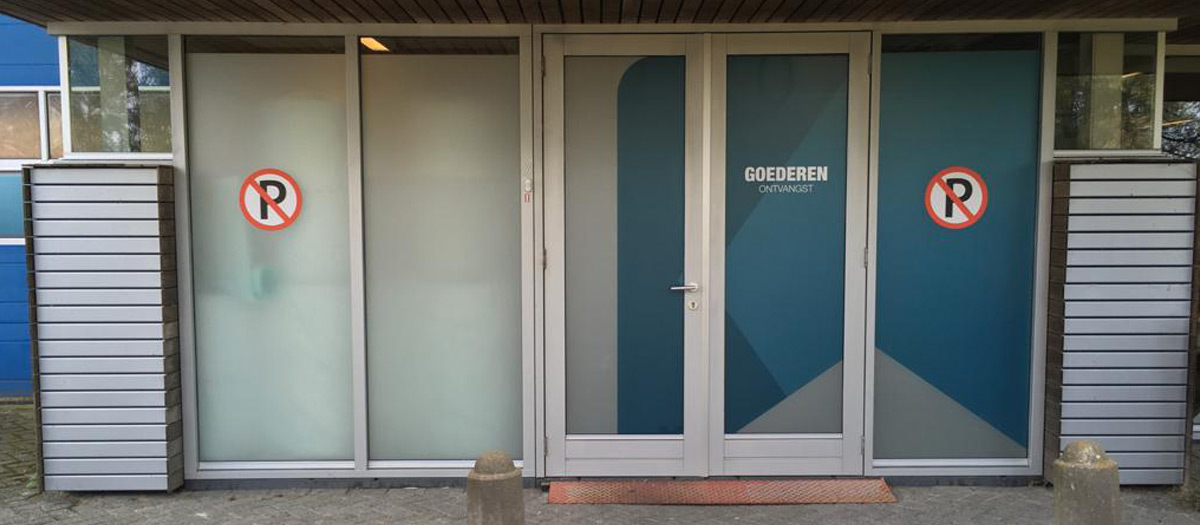 De ramen van de vele garagedeuren waren ook niet meer zo mooi, dus hebben we de onderste ramen voorzien van gezandstraalde folie. Deze folie hebben we voorzien van full color prints in dezelfde stijl en kleur als de rest. De losse A4tjes die her en der hingen, zijn vervangen door nette, overzichtelijke stickers.