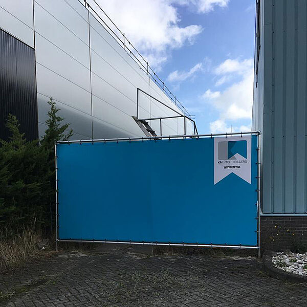 Als eerste hebben we voor de buitenzijde nieuwe dibond platen met daarop een mooie full color print gemaakt. Deze zijn over de bestaande, verweerde panelen gemonteerd. Ook hebben we een hek afgedekt door middel van een buizenframe met doek.