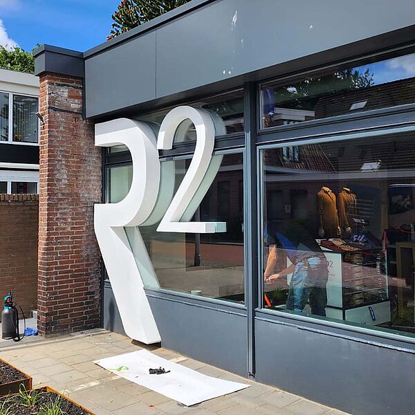 Het kledingmerk R2 Amsterdam, gespecialiseerd in stijlvolle herenkleding met een twist, heeft onlangs hun nieuwe hoofdkantoor in Amstelveen een unieke look gegeven. Willem Bakker, eigenaar van R2 Amsterdam, vertelt: “Ons pand is echt een eyecatcher geworden met het grote R2-logo dat doorloopt van de binnen- naar de buitenkant van het raam. Het is niet alleen stijlvol, maar ook een duidelijke herkenning voor klanten.” Wij werden als ZWF gevraagd om de volledige signing en gevelbelettering van het nieuwe pand te verzorgen, inclusief het opvallende R2-logo en diverse signage binnen het gebouw. Bakker vertelt: “Onze architect had een duidelijk beeld voor ogen en ZWF vertaalde dat uitstekend in de praktijk.”